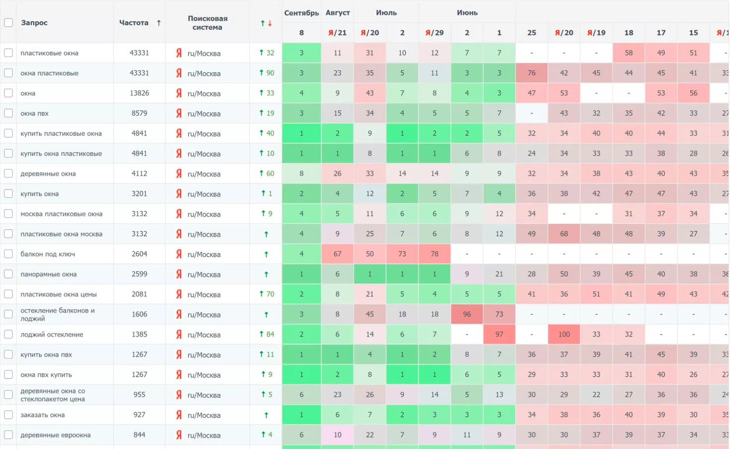 В случае продвижения по позициям, специалист собирает и согласовывает с заказчиком семантическое ядро, которое обычно состоит из 100-500 высокочастотных запросов, и постепенно выводит их в ТОП поисковой выдачи.