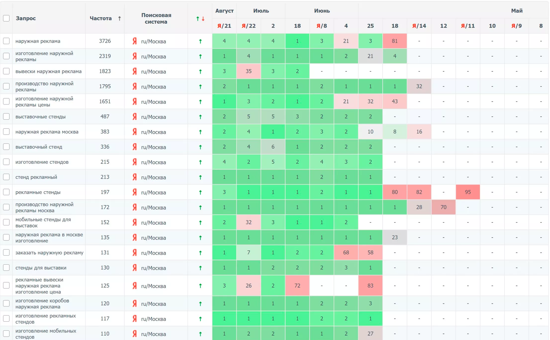 Проверить эффективность такой раскрутки достаточно просто, так как заказчику достаточно лишь выяснить на каких местах находится проект по нужным ключевым фразам. Чтобы не заниматься этим вручную, можно воспользоваться онлайн-сервисами, которые группируют статистику по всем продвигаемым запросам в одном окне и предоставляют удобный отчёт о видимости ресурса в поисковых системах.